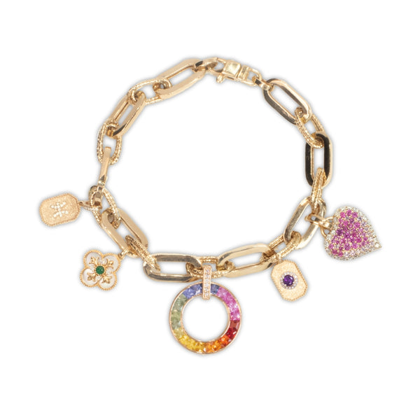 Celebrate life’s vibrant moments with this charm set! Featuring a radiant rainbow circle for joy, a sparkling heart for love, a delicate flower for growth, a sparkly gem for elegance (birthstone), and a golden charm for uniqueness (zodiac sign)